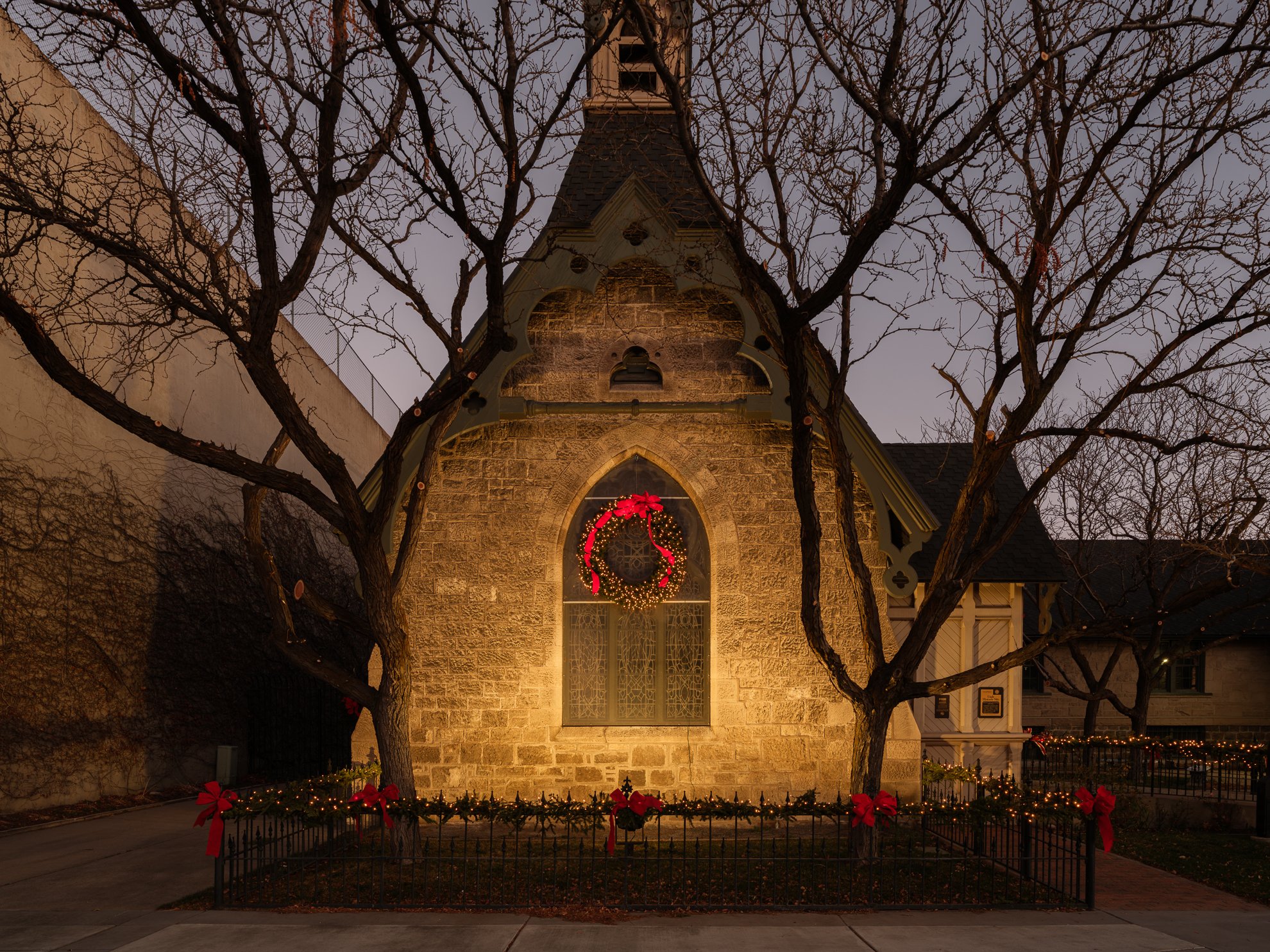 Just before the season changes and decor is stored away I took a moment to quietly reflect outside a small church in downtown Ogden. The light on this window and wretch delicately held in place by bare branches created this scene. I took an image to remember it.
